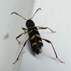 (Burlington, 6/23/00 6pm) This beetle looks like it should be closely related to M. robiniae, above, but I can't find a good match. It is close to one of the Clytus species, but not quite right. Unfortunately, my photos aren't great.
