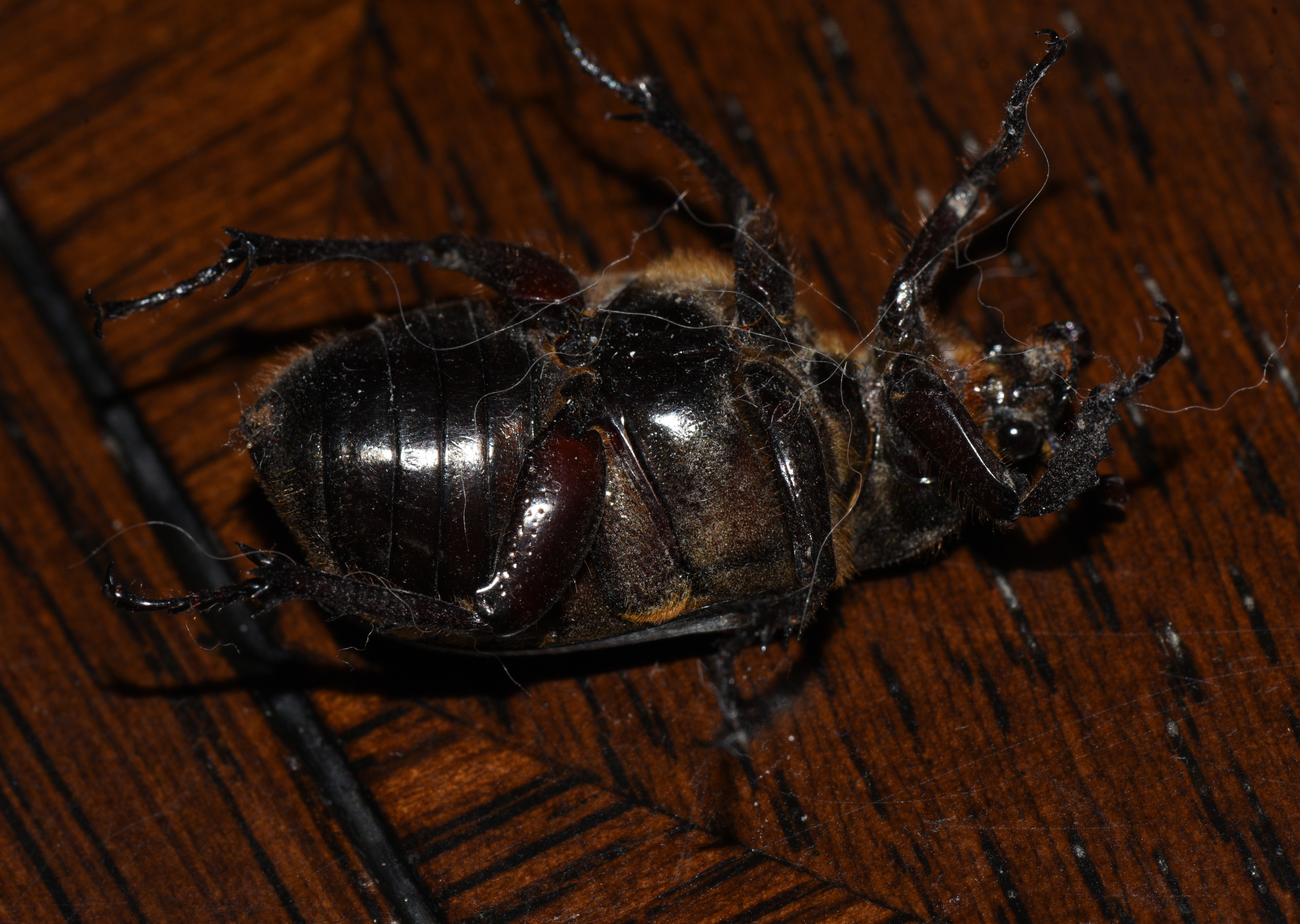 Odontotaenius disjunctus (Patent Leather Beetle) (Willard's Woods, ?, Lexington, 8/9/17 11pm) I I heard this giant flying long before I saw it land on the forest floor. I found the second one on the floor of our family room and photographed it on my desk.