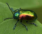 Calligrapha sp. (Willard's Woods, 6/9/04 3pm) I didn't realize that there are a number of Calligraphica species, each of which more or less specializes on a specific host plant. I think, but am no longer sure, that the beetle was on the plant I found it on and handn't flow to a different one.