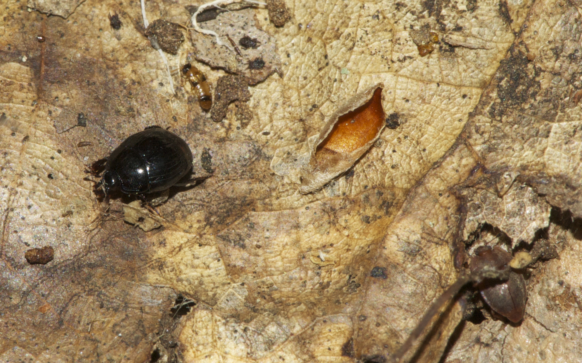 (Lower Vine Brook, 7/14/13 12pm) This patch of leaf litter was right next to the fungi photographed above. I was aiming for the black beetle, but closer inspection of the photo showed another brown beetle in the lower right, a baby spider, two ticks or mites (hopefully mites, but they look more like ticks), another fungus beetle like those above, 2 purplish springtails (horribly out of focus), and a truly tiny beetle above and to the left of the black one.