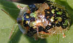 Charidotella sexpunctata bicolor (Golden Tortoise beetle) (Willard's Woods, 7/10/05 2pm & 7/6/03 3pm) They change color from gold to red when upset.