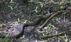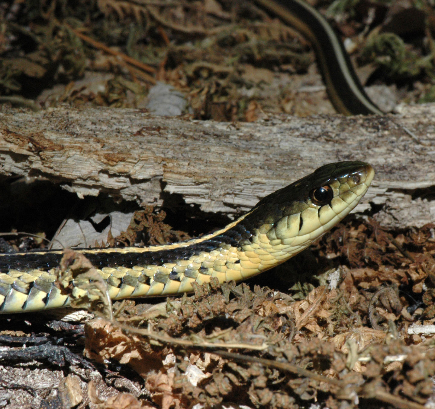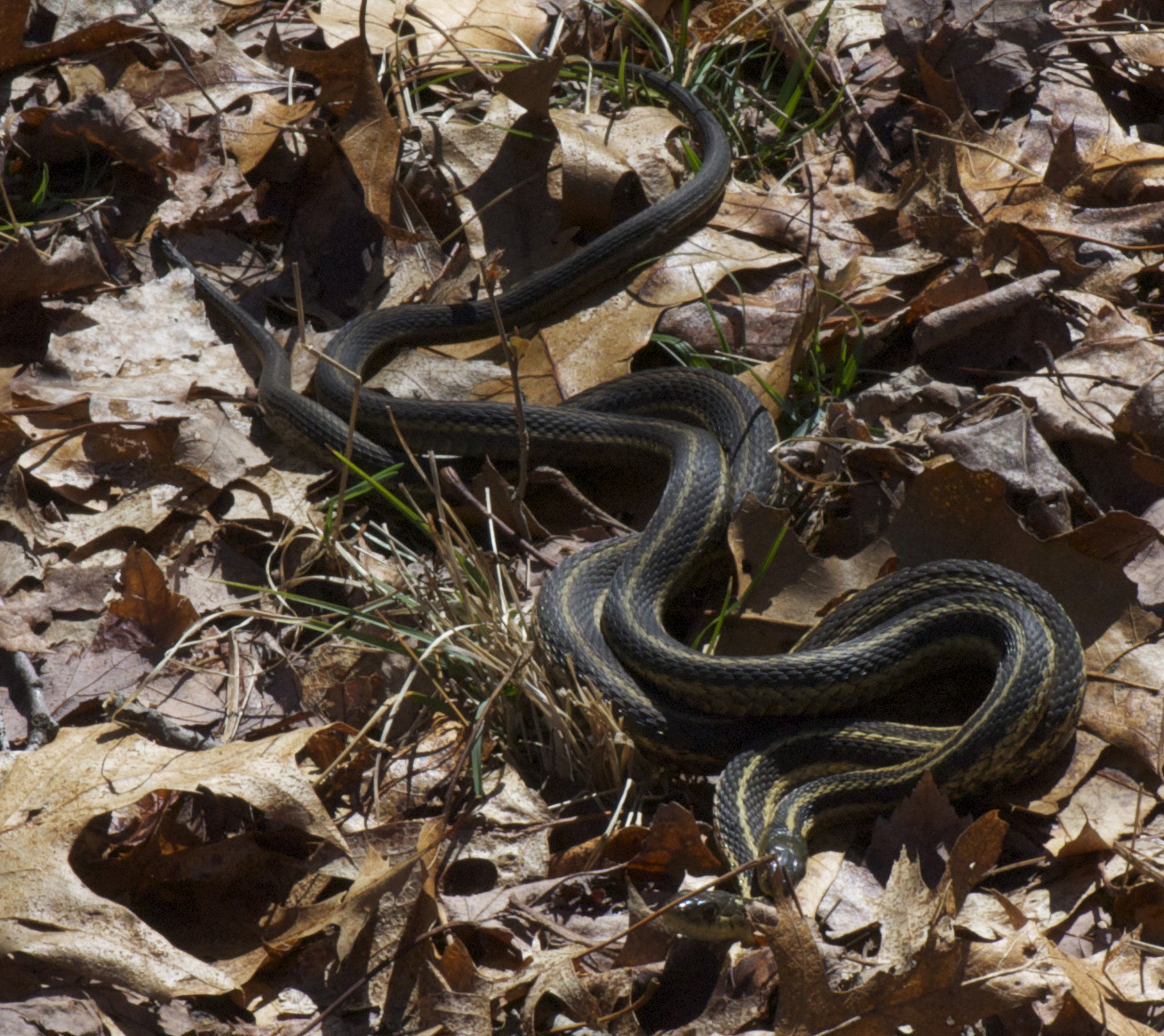 mating Thamnophis sirtalis (Common garter snake) (Whipple Hill, 9/23/07 12pm, Lower Vine Brook, 10/8/11 3pm, mating 4/12/14 11am) The second photo is of a juvenile, only about 6-8" long. It was sunning itself on the bike path and was quite ferocious about defending its spot. It struck at my hand multiple times, but I couldn't get a photo with its mouth open. My wife and son saw one trying to eat a tufted titmouse in our back yard. It wasn't clear if it killed the titmouse itself or if it found it dead. It gave up after it could only fit the head into its mouth.