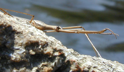 Ranatra fusca (Brown waterscorpion) (Willard's Woods, 4/18/02 1pm, 7/3/02 1pm, Lower Vine Brook, 8/2/15 5pm) I don't know why this guy was out of the water, but it provided a nice photo. I also saw a large water beetle jump out of the water and onto a grassy hump.