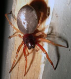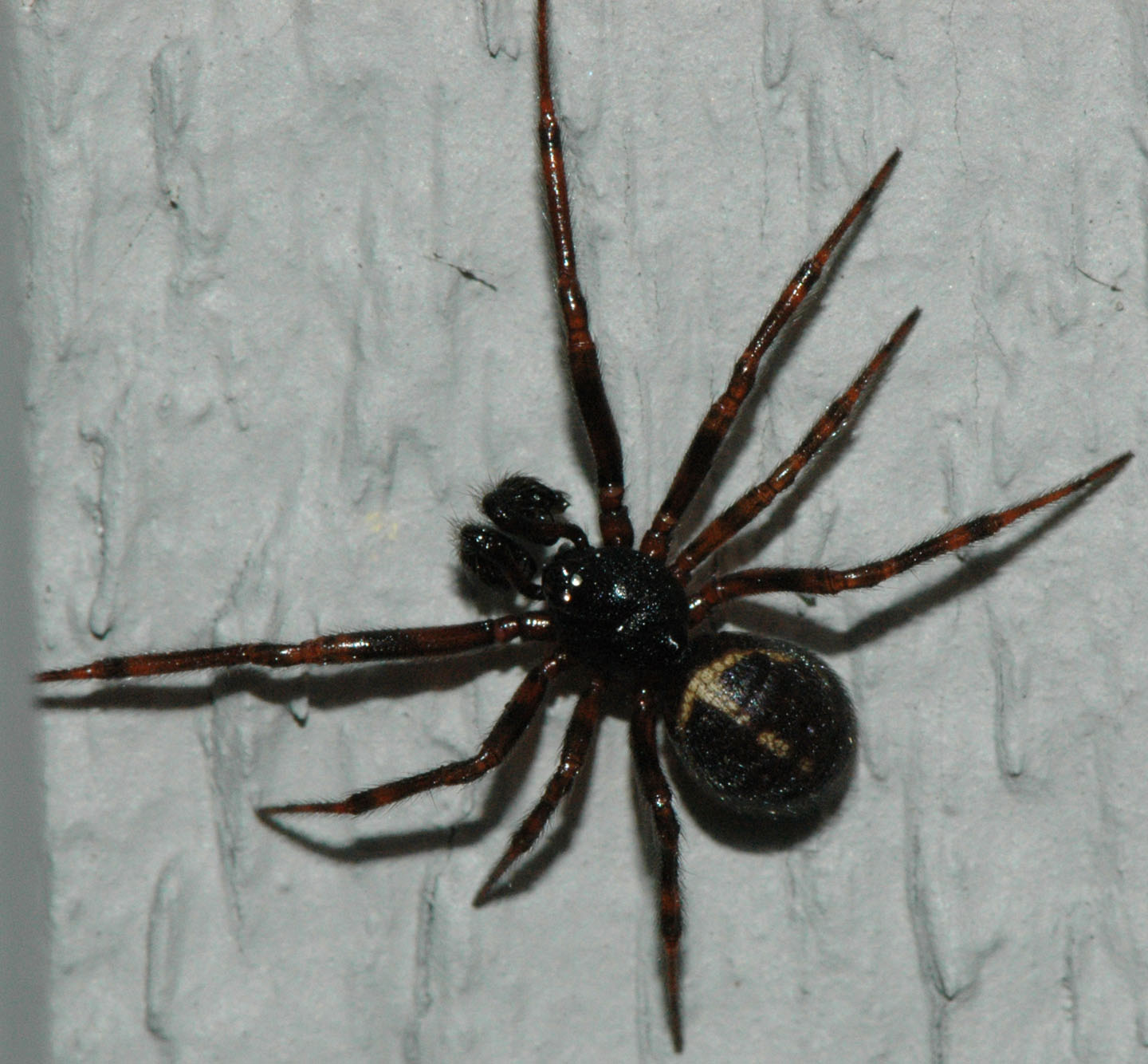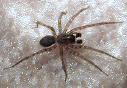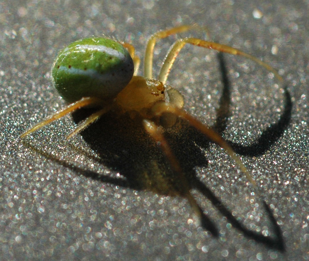 (Lexington, 7/11/05 8:30am) The interesting background is the roof of my car! The paint doesn't look at all the same color (gold/sand) at this angle and magnification than it does from a distance. However, the spider is reasonably correctly colored.